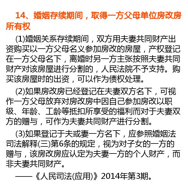 9、父母为子女出资购房所有权归属问题 在处理离婚纠纷中父母为子女出资所购房屋归属问题时,应根据《婚姻法》第17条、第18条,《婚姻法解释(三)》第7条,《婚姻法解释(二)》第22条等法律、司法解释之规定,区分父母出资购房的时间、房屋登记的所有权人、父母出资购房的出资比例及出资方式等因素来确定该房屋所有权的最终归属。 ——最高人民法院民事审判第一庭:《父母为子女出资购房所有权归属问题》,载奚晓明主编、最高人民法院民事审判第一庭编著:《民事审判前沿》(第一辑),人民法院出版社2014年版,第241-244页。 |